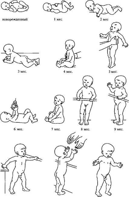 Рис. 9. Динамика развития двигательных функций ребенка (норма) Поза сидения в норме формируется к 7 —9 мес. У детей с ДЦП такое положение тела оказывается освоенным примерно к 2 — 3 годам. Ползание, как достаточно сложный моторный акт, требующий координации движений рук и ног, формируется у детей с ДЦП также со значительным опозданием. Прямостояние у здоровых детей развивается к 9— 10 месяцам. Многие из детей с ДЦП овладевают вертикальным статическим положением лишь в дошкольном возрасте. С особым трудом эта функция формируется у детей с атонически-астатической формой ДЦП. Ходьба — это не только новый этап в моторном развитии, но и расширение познавательных горизонтов. В норме ходьба как двигательный акт начинает формироваться с I года. Лишь половина дошкольников с ДЦП овладевает ходьбой к 4 годам. Остальные дети овладевают ею в последующие годы жизни либо не овладевают вовсе. Еще более отсроченным во времени от возрастных нормативов оказывается формирование сложных моторных актов, тонких и дифференцированных движений, которые необходимы для самообслуживания, осуществления предметно-игровой, изобразительной, учебной и трудовой деятельности. Иногда создается видимость усугубления заболевания с возрастом. Между тем ДЦП является непрогрессирующим неврологическим заболеванием. Иллюзия текущего патологического процесса возникает в связи со все большим несоответствием между двигательными возможностями ребенка и все возрастающими требованиями, предъявляемыми к растущему организму.