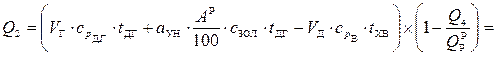 или в процентах от располагаемой теплоты топлива (9.58): q 1 + q 2 + q 3 + q 4 + q 5 + q 6 = 100%, где Следует отметить, что реальные данные о работе КА получаются путем проведения прямых и косвенных измерений соответствующих величин. Соответственно всегда эти величины определяются с некоторой погрешностью. Это, в свою очередь, приводит к появлению невязки теплового баланса, которая рассчитывается по формуле (9.67): Δ Q НЕВ = Располагаемая теплота на 1 кг топлива определяется по формуле (9.15):