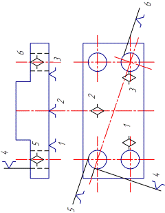 осей отверстий к плоскости А и симметричность отверстий относительно общей плоскости симметрии Б.