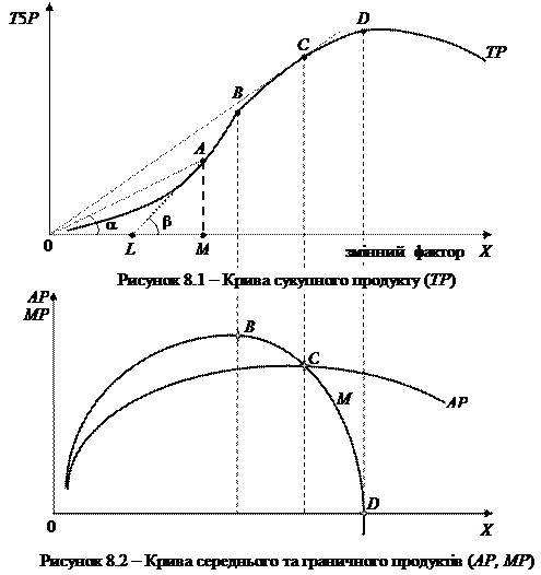 де Y – величина постійного фактора; X – величина змінного фактора. При зміні кількості сполучень факторів виробництва змінюється й обсяг випуску продукції. Показниками результативності виробництва є сукупний продукт (TP), середній продукт (AP), граничний продукт (MP). Сукупний продукт – це загальна кількість зробленого продукту. Він змінюється в процесі збільшення використання змінного фактора Х за інших незмінних умов. Середній продукт – це відношення сукупного продукту до кількості використаного у виробництві змінного фактора: АР = ТР/Х. Граничний продукт – це приріст випуску продукції при використанні додаткової одиниці змінного ресурсу: МР = Δ ТР /Δ Х. Зазначені залежності можна показати графічно: Крива сукупного продукту відображає, як змінюється випуск продукції при зміні одного з факторів виробництва, тоді як інші залишаються незмінними (рис. 8.1). Середній продукт змінного фактору можна визначити, якщо виміряти нахил променя, проведеного від початку координат через відповідну точку кривої сукупного продукту. Так, нахил променя ОА можна визначити через співвідношення координат точки А: Q 1/ Х 1. Це буде середній продукт у точці А: АР = tgα = AМ / OМ = TP / Х. Він досягне свого максимуму у т. С, яка відповідає точці дотику променя, що виходить від початку координат до кривої сукупного продукту. Якщо проведемо дотичну в т. А на кривій сукупного продукту та знайдемо тангенс кута β, то отримаємо граничний продукт: МР = tgβ = АМ/LМ = Δ ТР /Δ Х. (Рис. 8.2).