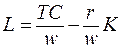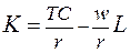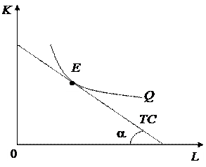 Кожен виробник, купуючи фактори для організації виробництва, має обмеження в засобах. Нехай фактор " праця" (L – вісь X) і фактор " капітал" (K – вісь Y) є змінними. Вони мають визначені ціни (r – ціна капіталу, w- ціна праці на період аналізу залишаються постійними). Тоді витрати на придбання ф актора " працю" складуть wL, а фактора " капітал" – rK. Сукупні витрати (TC – const) складуть:
