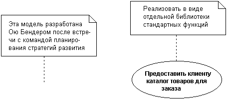 Примітки (notes) в мові UML призначені для включення в модель довільної текстової інформації, що має безпосереднє відношення до контексту проекту, що розробляється. Такою інформація можуть бути коментарі розробника (наприклад, дата і версія розробки діаграми або її окремих компонентів), обмеження (наприклад, на значення окремих зв'язків або екземпляри сутності). На діаграмі варіантів використання примітка може нести найзагальнішу інформацію, що відноситься до спільного контексту системи. Графічно примітки позначаються прямокутником з " загнутим" верхнім правим кутоком (мал. 4.5). Усередині прямокутника міститься текст примітки. Примітка може відноситися до будь-якого елементу діаграми, в цьому випадку їх сполучає пунктирна лінія. Якщо примітка відноситься до декількох елементів, то від нього проводяться, відповідно, декілька ліній. Примітки можуть бути присутніми не лише на діаграмі варіантів використання, але і на інших канонічних діаграмах.