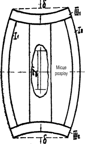 Вирішуючи спільно рівняння /1/ і /2/ визначаємо значення Р (кгс) і М (кгс/мм). Величину напруг в тонких I, товстих II і поперечних III брусках визначають з рівнянь: