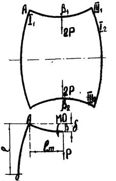Для визначення величини залишкових ливарних напруг застосовують спеціально відлиті усадкові проби різної форми. Найзручнішими для лабораторних досліджень є проба у вигляді решітки (рис.4.1). Коли товстий брусок II при охолоджуванні досягає температури 620° і перейде в пружний стан, тонкі бруски I мають вже низьку температуру і перешкоджає подальшій усадці бруска II. Унаслідок термічного гальмування усадки до кінця охолоджування тонкі бруски I1 і I2 виявляються пружно стислими на величину – Δ I, товстий брусок II пружно розтягнутим на величину +Δ II, а поперечні бруски III пружно зігнутими на величину 2Δ III. Абсолютна величина пружних деформацій системи 2Δ =2Δ III+Δ I-Δ II мм Якщо поперечні бруски III мають малу товщину, то величини___ в порівнянні з 2Δ III дуже малі. Під впливом внутрішніх напруг в тонких, товстому і поперечних брусках система знаходиться в рівновазі, але бруски усадкової решітки I, II і III деформуються згідно схемі рис.4.2. Замінюємо дію бруска II силою 2Р, а дія Δ правої половини решітки на ліву - горизонтальною силою х і моментом М. Горизонтальні сили х, прикладені до окремих брусків, взаємно знищуються. Розрізаючи брусок I посередині висоти, можемо уявити його закріпленим в точці 0 (рис.4.3). Під дією вертикальної сили Р і згинаючого моменту М, ця частина усадкової решітки деформується по схемі (рис.4.3). Загальна величина пружних деформацій Δ є сумою алгебри переміщень крапки В на поперечному бруску III і деформацію половини бруска II. Застосовуючи методи опору матеріалів, переміщення крапки В від вигину бруска III силою P і обертаючим моментом М, можна визначити з виразу:
