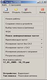 При початку нової роботи Ви повинні натискувати кнопку «Нова робота», але якщо ви тільки що запустили програму «Майстер дослідження ПЕМВН», то при його запуску автоматично починається нова робота і натискувати кнопку, в цьому випадку, необхідності немає. Ім’я, пропоноване за умовчанням програмою містить поточні число, місяць, рік і час. Можна ввести довільне ім’я файлу, наприклад " Принтер Lexmark Офіс 16.01.2001 ". Розширення " pmi" вводити необов’язково, програма додасть його до введеного імені. Рекомендується використовувати імена файлів з вказівкою місця і дати проведення дослідження, назва досліджуваної техніки. В даному прикладі використовується ім’я файлу пропоноване програмою. В списку досліджуваних пристроїв обрати пристрій, і натиснути клавішу «Далі».