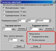 Також слід визначити, чи залежить модуляція сигналу від характеру оброблюваної інформації, або модуляція виникає просто при роботі пристрою. Для цього перемкнути параметр Посилані дані - Бланк. При цьому записуються/прочитуються дані у вигляді серії нулів. На інформативній частоті спостерігається стійка відмінність межу сигналами тестових режимів Меандр і Бланк. Якщо відмінності немає, частота неінформативна, хоча сигнал належить пристрою і виникає при роботі пристрою, модуляція не містить оброблюваних даних. Якщо перша інформативна частота знайдена, можна встановити параметр Посилані дані - Пачки меандрів. При цьому в інформативному сигналі з’явиться модуляція серією імпульсів. Запам'ятавши візуально і на слух вид модуляції можна подібні сигнали помітити як інформативні. Таким чином перевірити всі частоти, інформативним частотам слід встановити статус " Інформативна", неінформативним - " Перевірена". Після завершення ідентифікації всіх частот обрати кнопку Далі і перейти до вимірювання.