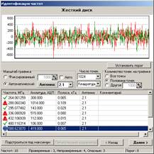 Також необхідно виставити поріг. Значення порогу, що рекомендується, 100 од. АЦП. Для того, щоб змінити поріг сканування Вам необхідно задати його в полі введення «Поріг виявлення» (рис. 8??? чи 10). Після введення всіх параметрів необхідно провести виявлення частот, для цього натискуйте кнопку «Провести виявлення частот». А якщо Ви хочете відразу перейти до вікна «Ідентифікації частот», то Вам необхідно натискувати кнопку «Пропустити виявлення частот». При виявленні частот з’явиться вікно сканування (рис. 9), в якому буде показаний процес сканування, з можливістю відміни.