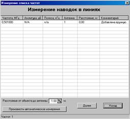 За необхідності Ви можете розташувати вимірювальну антену на іншій відстані, але при цьому Вам необхідно в полі введення відстані внести відповідні корективи. Тепер необхідно запустити досліджуваний пристрій в тестовому режимі і в програмі «Майстер ПЕМВН» натискувати кнопку «Провести автоматичне вимірювання». Програма зміряє список частот і в стовпці «Амплітуда, дБ» з’являться амплітуди виміряних частот. Після вимірювання списку натискуйте кнопку «Далі».