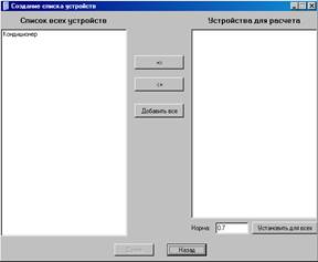 Для продовження натискуйте «Далі». Ви потрапите у вікно «Створення списку пристроїв» (рис 25). Це вікно складається з двох списків: списку досліджуваних пристроїв і списку пристроїв для розрахунку. В цьому вікні Вам необхідно сформувати список пристроїв, для яких Ви хочете сформувати протокол. Також в цьому вікні Ви можете задати норму для всіх пристроїв. По закінченню створення списку натискуйте кнопку «Далі» і потрапите у вікно «Додаткова інформація для протоколу» (рис 26).