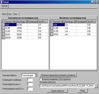 12. Оцінка захищеності 12.1. Розрахунок за допомогою майстра розрахунків Для розрахунків зон перехоплення Вам необхідно у вікні «Результати роботи» (Рис. 18) обрати опцію «Розрахунок і протокол», а в сторіночці (рис. 21), що з’явилася, Вам необхідно обрати пункт «Розрахункова програма». Сама програма повинна знаходитися по вказаному шляху в строчці введення «Шлях до розрахункової програми». Якщо ви хочете проглянути зони перехоплення тільки для поточного пристрою, то оберіть пункт «Поточні пристрій». Для запуску майстра звітів натискуйте кнопку «Розрахунок». З’явиться вікно з параметрами даного пристрою. В цьому вікні Вам необхідно ввести тактову частоту (якщо вона не введена) і норму. Ці параметри необхідні для розрахунку. Вся решта параметрів вводиться тільки для протоколу.