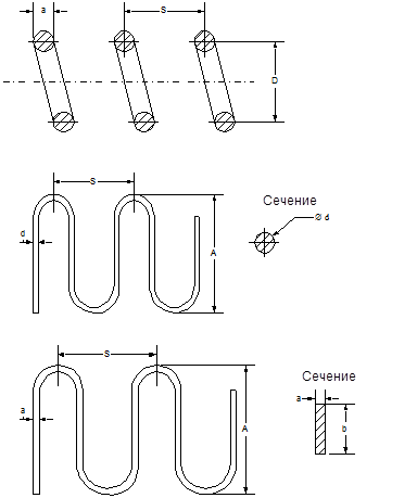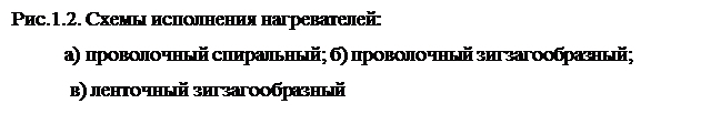 Конструктивно металлические нагреватели могут выполняться ленточными, зигзагообразными, проволочными зигзагообразными и ленточными, а также штампованными из листа, литыми и др. (рис. 1.2). В большинстве случаев более рациональным является проволочный зигзагообразный нагреватель, который при прочих равных условиях имеет меньший эксплуатационный расход материала, большую удельную поверхностную мощность. Под эксплуатационным расходом понимается расход материала нагревателя за 1000 часов его работы на 1 кВт установленной мощности. Расход материала обуславливается окислением и увеличивается с повышением рабочей температуры. Под сроком службы нагревателя понимают время его работы при заданной температуре, в течении которого токопроводящее сечение нагревателя уменьшается на заданную величину (обычно на 20%), что сопровождается увеличением сопротивления и снижением мощности на ту же величину. Наилучшим с точки зрения эксплуатационного расхода является проволочный зигзагообразный нагреватель. Проволочный спиральный нагреватель используется лишь в случаях, когда невозможно применить зигзагообразный нагреватель. За максимально допустимую температуру рекомендуется брать температуру, при которой срок службы данного нагревателя не ниже 2000 часов.
