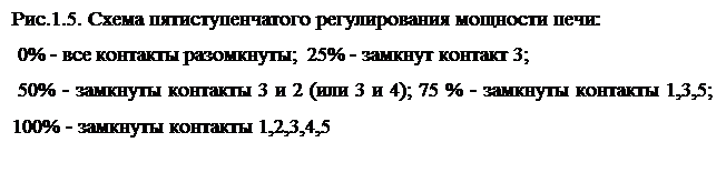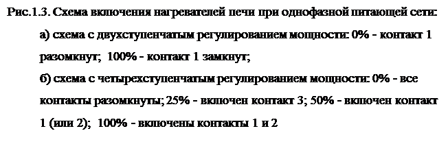 Схемы включения нагревателей при однофазной питающей сети приведены на рис.1.3: а – двухступенчатое регулирование мощности; б – четырехступенчатое регулирование мощности. Рассмотрим, каким образом осуществляется регулирование мощности нагревателей печи сопротивления на примере, приведенном на рис.1.3б.