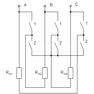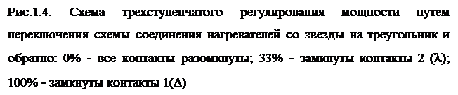 Максимальная потребляемая мощность РМ4 (100%) имеет место при включенных контактах 1 и 2. Таким образом, в схеме (рис.1.3б) реализуется четыре ступени регулирования мощности: 0%, 25%, 50%, 100%. В случае трехфазной питающей сети, трехступенчатое регулирование мощности может быть осуществлено путем переключения схем соединения нагревателей со звезды на треугольник и обратно по схеме, приведенной на рис.1.4. Более плавное пятиступенчатое регулирование мощности может быть осуществлено по схеме, приведенной на рис.1.5.