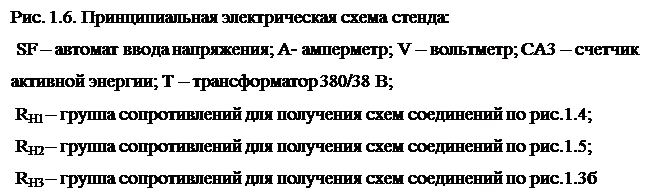 Программа работы Принципиальная электрическая схема стенда приведена на рис.1.6. После предварительного знакомства со стендом и входящими в него приборами приступают к выполнению работы в следующем порядке: 1. Собрать схему соединения нагревателей в соответствии с рис.1.3 б, 1.4 и 1.5. 2. После проверки схемы преподавателем (лаборантом) подать напряжение при помощи автомата SF. 3. Снять показания приборов и записать их в таблицу 1.2. 4. Обработать опытные данные, построить зависимости cosj = f(p), для каждой схемы включения нагревателей. Потребляемую мощность рассчитать по формуле: