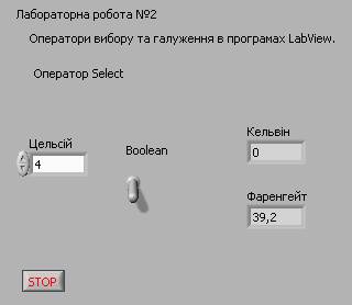 Хід роботи 1. Розробіть програму для переведення значення температури, поданого у градусах Цельсія, в температурну шкалу Кельвіна та температурну шкалу Фаренгейта із використанням оператора Select. Програма повинна мыстити регулятор (наприклад поле вводу) для задання температури у градусах Цельсія, логічний перемикач і два індикатори для відображення температури у шкалах Кельвіна та Фаренгейта відповідно. При вмиканні перемикача у один із станів, що означають температурну шкалу, на відповідному індикаторі повинне відображатися значення температури, а на іншому – нуль.