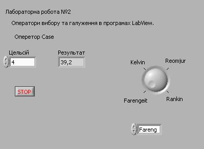 Мета: Спроектувати віртуальний прилад для переведення значень температури між температурними шкалами Цельсія, Фаренгейта та Кельвіна із використанням інструментів Selectта Case.