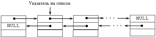 Для ускорения многих операций целесообразно применять переходы между элементами списка в обоих направлениях. Это реализуется с помощью двунаправленных списков, которые являются сложной динамической структурой. Двунаправленный (двусвязный) список – это структура данных, состоящая из последовательности элементов, каждый из которых содержит информационную часть и два указателя на соседние элементы (рис. 29.4). При этом два соседних элемента должны содержать взаимные ссылки друг на друга. В таком списке каждый элемент (кроме первого и последнего) связан с предыдущим и следующим за ним элементами. Каждый элемент двунаправленного списка имеет два поля с указателями: одно поле содержит ссылку на следующий элемент, другое поле – ссылку на предыдущий элемент и третье поле – информационное. Наличие ссылок на следующее звено и на предыдущее позволяет двигаться по списку от каждого звена в любом направлении: от звена к концу списка или от звена к началу списка, поэтому такой список называют двунаправленным.