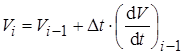 Дифференциалы на каждом шаге расчета заменяем конечными приращениями. С учетом того, что правую часть уравнения на каждом шаге считаем постоянной, для i -го шага имеем: D Vi = z× j i -1× D t. То есть искомая кривая v (t) на каждом шаге заменяется касательной линией, проведенной в точке, соответствующей началу шага. Скорость движения и координата на i -м шаге: Vi = Vi -1 + D Vi;