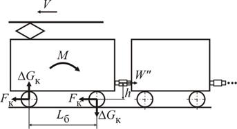 т.е. силу сцепления электровоза в целом следует определять как алгебраическую сумму сил, реализуемых отдельными колесами. Поскольку реализация сил сцепления определяется прежде всего реализацией коэффициента сцепления, то можно, по аналогии с факторами, влияющими на коэффициент сцепления, выделить три основных группы параметров, влияющих на реализацию силы сцепления: - изменение силы давления колеса на рельс; - геометрические характеристики взаимодействующих поверхностей колеса и рельса; - состояние взаимодействующих поверхностей колеса и рельса. В свою очередь, каждая группа факторов подразделяется на подгруппы и отдельные факторы. Рассмотрим более подробно некоторые из них. Изменение силы давления колеса на рельс может быть вызвано: - статической неравномерностью распределения массы электровоза по отдельным колесным парам и отдельным колесам, т.к. невозможно равномерно распределить оборудование внутри кузова электровоза; - вертикальными колебаниями электровоза, вызванными прохождением неровностей пути. Вертикальные колебания зависят от состояния пути, скорости движения и состояния рессорного подвешивания электровоза, включая гасители колебаний; - продольными колебаниями поезда, которые зависят от технической возможности тягового привода по плавности регулирования силы тяги, квалификации машиниста, плана и профиля пути и динамических характеристик состава. Продольные динамические усилия вызывают скачкообразное изменение силы сопротивления движению, которое приводит к перераспределению сцепной массы между колесными парами электровоза. Рассмотрим это явление на примере двухосного локомотива, который ведет поезд в режиме тяги с установившейся скоростью. Так как сила тяги реализуется на уровне оси колесных пар локомотива, а сила сопротивления движению от состава – на уровне автосцепки, то возникает вращающий момент М = W" × h = 2× F к× h, который первую по ходу колесную пару разгружает, а вторую – догружает на величину