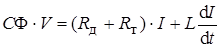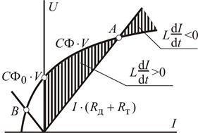 Здесь L – индуктивность цепи реостатного тормоза. На рисунке эти зависимости показаны с учетом начальной ЭДС E 0 = С Ф0× V. Заштрихованная область соответствует Отсюда можно сформулировать условие электрической устойчивости реостатного торможения: знак отклонения тока и ЭДС самоиндукции должны быть противоположны. При данной скорости положение точки A зависит от наклона линии (R д + R т)× I, т.е. от величины R т: при увеличении R т точка A смещается влево; при уменьшении – вправо. Следовательно, зная допустимые параметры ТД по току, а так же ограничение по сцеплению колес с рельсами возможно определить величину R т min при входе в торможение. Если при переходе в тормозной режим было изменено направление тока возбуждения, то произойдет размагничивание ТД и равновесие наступит в точке B, т.е. ток в цепи не равен нулю, но торможение неэффективно. Выразим из второго закона Кирхгофа ток цепи реостатного торможения в установившемся режиме: