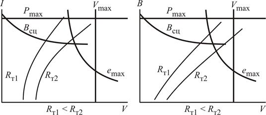 Тормозные характеристики, полученные для реальных ТЭД, имеют незначительную нелинейность, что следует объяснить нелинейной зависимостью магнитного потока от скорости. Из приведенных формул следует, что регулировать ток и тормозную силу можно изменяя величину тормозного резистора и магнитного потока, т.е. тока возбуждения. При увеличении сопротивления для реализации той же тормозной силы необходима большая скорость. Следовательно, для поддержания постоянной тормозной силы по мере снижения скорости движения необходимо уменьшать величину тормозного резистора. При увеличении магнитного потока для реализации той же тормозной силы необходима меньшая скорость. Следовательно, для поддержания постоянной тормозной силы по мере снижения скорости движения необходимо увеличивать ток возбуждения. На тормозные характеристики можно нанести следующие ограничения: - по максимальной скорости движения (V max); - по максимальной мощности торможения (P max); - по сцеплению (B сц); - по коммутации (е max) (по максимальному напряжению на коллекторе).