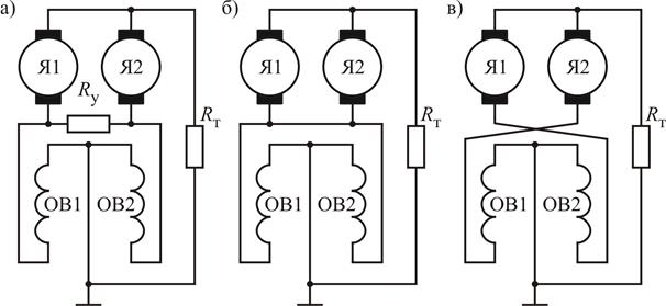 При параллельном включении ТД в режиме реостатного торможения с самовозбуждением остро стоит вопрос о выравнивании нагрузок по параллельным ветвям, так как уравнительный ток, возникающий из-за расхождения характеристик ТД, может вызвать нарушение электрического равновесия. Для уменьшения влияния расхождения характеристик ТД применяют уравнительные соединения (с уравнительным резистором (а) или без него (б). Но наибольший эффект дает применение перекрестного включения обмоток возбуждения (в).