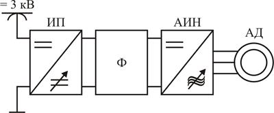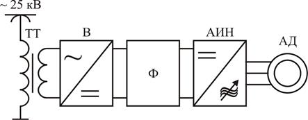 где С – постоянная, зависящая от параметров двигателя; U 1 – питающее напряжение; s – абсолютное скольжение ротора (разность частоты питающего напряжения и частоты вращения ротора); f 1 – частота питающего напряжения. Для питания АТД на ЭПС постоянного тока необходимо иметь автономный инвертор напряжения или тока. На ЭПС переменного тока кроме автономного инвертора необходим выпрямитель. И выпрямитель и инвертор могут быть объединены в одном полупроводниковом устройстве – преобразователе числа фаз (ПЧФ). На современном этапе развития силовой полупроводниковой техники выгоднее на ЭПС постоянного тока дополнительно иметь входной импульсный преобразователь для регулирования величины напряжения, подводимого к ТД.
