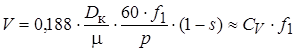 Выражение получено с допущением, что на рабочей части характеристики скорость движения пропорциональна частоте питающего напряжения без учета скольжения: