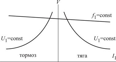 Для ЭПС наиболее характерен следующий закон регулирования: до скорости выхода на номинальную характеристику поддерживается постоянство силы тяги, а затем – постоянство мощности. Постоянство силы тяги означает постоянство вращающего момента. Вращающий момент определяется взаимодействием магнитного потока статора и тока ротора, приведенного к обмотке статора (I 2'). Следовательно, постоянство вращающего момента равносильно I 2' = const. Ток статора можно представить как сумму векторов тока намагничивания и тока ротора, приведенного к обмотке статора: