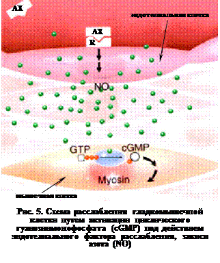 Поскольку монооксид азота – это газ, который легко растворяется как в воде, так и в жирах, он не может накапливаться и храниться в синаптических пузырьках. Косвенным следствием этого является тот факт, что NO не высвобождается посредством Ca2+-зависимого экзоцитоза везикул, а просто диффундирует из цитозоля, где он синтезируется, во внеклеточное пространство. При этом выделение газа не привязано к какой-либо части нервной клетки. В качестве паракринного передатчика сигнала монооксид азота впервые был охарактеризован в 1980 г. Р. Фернчгот и Дж. Завадский впервые показали, что т. н. эндотелиальный фактор, расcлабляющий сосуды, есть NO. Взаимодействие АХ с поверхностными рецепторами клеток эндотелия приводит к синтезу в них монооксида азота, диффундирующего к прилежащим гладкомышечным клеткам стенки сосуда, вызывая их расслабление, т. е. расширение кровеносного сосуда (рис. 5). Представления о роли NO как нейромодулятора сформировались только в конце 80-х гг. ХХ в., когда были получены доказательства его действия в нервной ткани. Локализация NO-ергических нейронов в ЦНС. Существует целый ряд трудностей, наличие которых в течение длительного времени осложняло картирование NO-продуцирующих нейронов: ü NO не хранится в синаптических пузырьках, он синтезируется «по мере надобности» в ответ на поступающие извне сигналы, ü концентрация крайне мала, ü время жизни также невелико, что затрудняет уже прямое детектирование in vivo.