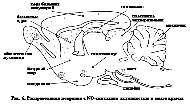 В большинстве случаев в качестве маркера возможной продукции NO клетками выступает NADPH-диафораза, один из ко-факторов синтеза монооксида азота. Кроме того, эффективным способом картирования NO-ергических нейронов является использование флуоресцентных красителей, способных специфически связываться с молекулой монооксида азота. В ЦНС удается выявить все три формы NO-синтазы (см. далее). Нитрергические клетки широко представлены (рис. 6) среди: ü нейронов обонятельной луковицы, ü гипоталамуса (супраоптическое ядро), ü коры больших полушарий, ü гиппокампа, ü базальных ядер (хвостатое ядро и скорлупа), ü пластины четверохолмия среднего мозга, ü мозжечка, ü ядер ствола. Имеются свидетельства о продукции NO клетками глии, а также его ко-локализации с ГАМК и нейропептидом Y.