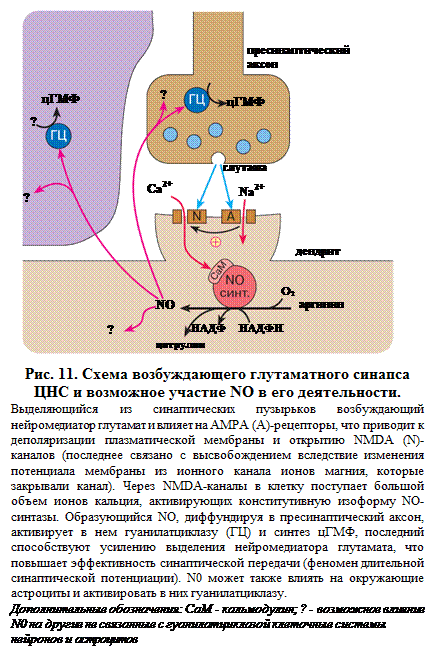 Особенно стоит отметить роль NO в развитии долговременной потенциации (ДВП) в нейронах коры больших полушарий и гиппокампа, а также долговременной депрессии (ДВД) – снижении эффективности проведения возбуждения через синапс – в нейронах мозжечка. В первом случае – при возникновении ДВП – возбуждение постсинаптического окончания приводит к повышению внутриклеточного уровня Са2+/кальмодулина, активирующих NO-синтазу и образование NО. NО, диффундируя в пресинаптическое окончание, вызывает образование цГМФ, что приводит к усилению и увеличению длительности выделения из пресинапса нейромедиатора, который, в свою очередь, оказывает возбуждающее действие на постсинаптический нейрон и таким образом возникает обратная положительная связь с постоянным усилением. Такому механизму особое внимание уделяется в синапсах с наиболее распространенным и сильным возбуждающим нейромедиатором ЦНС глутаматом и особому глутаматному рецептору – NMDA-рецептору, являющемуся трансмембранным каналом для ионов кальция (рис. 11).