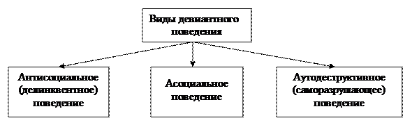 Антисоциальное (делинквентное) поведение - это поведение, противоречащее правовым нормам, угрожающее социальному порядку и благополучию окружающих людей. Оно включает любые действия или бездействия, запрещенные законодательством. У взрослых людей (старше 18 лет) делинквентное поведение проявляется преимущественно в форме правонарушений, влекущих за собой уголовную или гражданскую ответственность и соответствующее наказание. У подростков (от 13 лет) преобладают следующие виды делинквентного поведения: хулиганство, кражи, грабежи, вандализм, физическое насилие, торговля наркотиками. В детском возрасте (от 5 до 12 лет) наиболее распространены такие формы, как насилие по отношению к младшим детям или сверстникам, жестокое обращение с животными, воровство, мелкое хулиганство, разрушение имущества, поджоги. Асоциальное поведение- это поведение, уклоняющееся от выполнения морально-нравственных норм, непосредственно угрожающее благополучию межличностных отношений. Оно может проявляться как агрессивное поведение, сексуальные девиации (беспорядочные половые связи, проституция, совращение, вуайеризм, эксгибиционизм и др.), вовлеченность в азартные игры на деньги, бродяжничество, иждивенчество. В подростковом возрасте наиболее распространены уходы из дома, бродяжничество, школьные прогулы или отказ от обучения, ложь, агрессивное поведение, промискуитет (беспорядочные половые связи), граффити (настенные рисунки и надписи непристойного характера), субкультуральные девиации (сленг, шрамирование, татуировки). У детей чаще встречаются побеги их дома, бродяжничество, школьные прогулы, агрессивное поведение, злословие, ложь, воровство, вымогательство (попрошайничество). Границы асоциального поведения особенно изменчивы, поскольку оно более других поведенческих девиаций находится под влиянием культуры и времени. Аутодеструктивное (саморазрушительное поведение) - это поведение, отклоняющееся от медицинских и психологических норм, угрожающее целостности и развитию самой личности. Саморазрушительное поведение в современном мире выступает в следующих основных формах: - суицидальное поведение, - пищевая зависимость, - химическая зависимость (злоупотребление психоактивными веществами), - фанатическое поведение (например, вовлеченность в деструктивно- религиозный культ), - аутическое поведение, - виктимное поведение (поведение жертвы), - деятельность с выраженным риском для жизни (экстремальные виды спорта, существенное превышение скорости при езде на автомобиле и др.). Большинство авторов, например, Ю.А. Клейберг, выделяют три основные группы поведенческих девиаций: - негативные(например, употребление наркотиков), - позитивные(например, социальное творчество, стремление личности к превосходству, к новому самоутверждению в социальнополезных видах деятельности. Это может быть героизм, альтруизм, самопожертвование, сверхтрудолюбие, высочайшая преданность, выдающееся научное открытие, изобретение и т.д.), - социально-нейтральные(например, попрошайничество). В нормально развивающемся обществе 10 – 12 % населения приходится на отрицательную девиацию и столько же на положительную. Оставшаяся часть - немногим более 70% населения составляют люди без отклонений в поведении. Один из наиболее полных и интересных вариантов систематизации вид