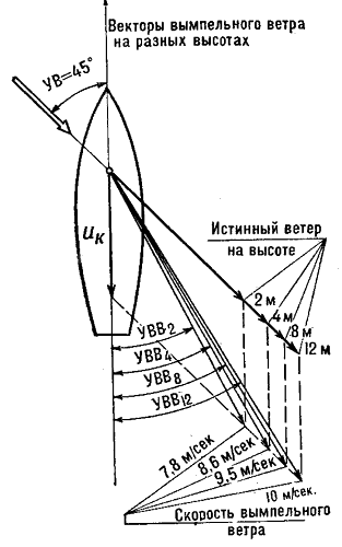 — при сильных ветрах отношение скорости судна к скорости ветра меньше, чем при слабых. Поэтому скорость вымпельного ветра при слабых ветрах гораздо больше отличается от скорости истинного ветра. Это практически используют при так называемой лавировке на фордевинд, когда выгоднее идти по ломаной линии и галсами в бакштаг, чем по прямой курсом фордевинд. На буерах, катамаранах и глиссирующих судах, скорость которых увеличивается почти пропорционально скорости ветра (в известных пределах), лавируют на фордевинд и при средних ветрах. Изменение скорости истинного ветра при лавировке заставляет изменять курс для сохранения оптимального угла вымпельного ветра. Каждому яхтсмену известно, что при порывах ветра можно идти круче к истинному ветру, а при ослаблении его приходится уваливать. Обратимся к рис. 92, на котором U— вектор истинного ветра, V — вектор курсового ветра (скорость яхты), W —вектор вымпельного ветра, и ab — оптимальный угол вымпельного ветра, обеспечивающий наивыгоднейшую скорость лавировки. Допустим, яхта попала в полосу более сильного ветра того же направления, вектор которого на рисунке обозначен U1. Она вначале по инерции будет идти с прежней скоростью V, а вектор вымпельного ветра окажется равным W1, и направление его отойдет от курса яхты еще на угол Да. Таким образом, сохраняя оптимальный угол вымпельного ветра аь, можно привестись на величину угла Да. Увеличение скорости ветра, в свою очередь, несколько увеличит скорость яхты, и придется чуть-чуть увалиться, и все же курс будет круче первоначального. При ослаблении ветра — противоположная картина: надо уваливаться. Теперь представим себе, что в полный штиль яхту (без парусов) несет быстрое течение. Очевидно, как и при буксировке, судно встретит поток воздуха, скорость которого равна скорости течения воды, но направленной в противоположную сторону. Таким образом, течение воды, сообщая яхте движение относительно воздуха, также влияет на вымпельный ветер, а следовательно, и на крутизну лавировки следующим образом: — при лавировке по течению вымпельный ветер усилится и угол его будет больше, чем при отсутствии течения; значит, яхта может идти круче, а снос течением увеличит ее скорость относительно берега: — при лавировке против течения вымпельный ветер уменьшится и угол его будет меньше. Яхте придется идти полнее (относительно истинного ветра), а течение будет уменьшать ее скорость относительно берегов. В заключение остановимся на одном очень важном с точки зрения работы паруса моменте. Напомним, что с высотой скорость ветра возрастает. Если построить параллелограммы скоростей ветра на разных высотах паруса (рис. 93), можно видеть, что при скорости яхты 3, 5 м/сек и угле истинного ветра 45° скорость вымпельного ветра с увеличением высоты от 2 до 12 м возрастает с 7.8 до 10 м/сек. При этом угол вымпельного ветра (УВВ) увеличивается от 25 до 30°. Вот почему парус необходимо кроить так, чтобы для сохранения оптимального угла атаки он несколько закручивался снизу вверх, с «отвалом» задней шкаторины под ветер. Надо сказать, что эта закрутка, естественно, может быть больше при слабых ветрах, чем при сильных.