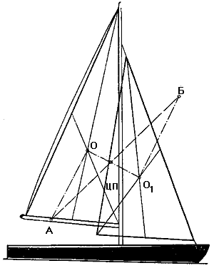 Из механики известно, что всякая сила определяется ее величиной, направлением и точкой приложения. До сих пор мы говорили только о величине и направлении сил, приложенных к парусу. Как мы увидим дальше, знание точек приложения имеет большое значение для понимания работы парусов. Давление ветра распределяется по поверхности паруса неравномерно (большее давление испытывает его передняя часть), однако для упрощения сравнительных расчетов считают, что оно распределяется равномерно. Для приближенных расчетов равнодействующую силу давления ветра на паруса полагают приложенной к одной точке; за нее принимают центр тяжести поверхности парусов, когда они помещены в диаметральной плоскости яхты. Эту точку называют центром парусности (ЦП). Остановимся на самом простом графическом способе определения положения ЦП (рис. 98). Вычерчивают парусность яхты в нужном масштабе. Затем на пересечении медиан — линий, соединяющих вершины треугольника с серединами противоположных сторон, — находят центр каждого паруса. Получив таким образом на чертеже центры О и O1 двух треугольников, составляющих грот и стаксель, проводят через эти центры две параллельные линии ОА и O1Б и на них откладывают в противоположных направлениях в любом, но одинаковом масштабе столько линейных единиц, сколько квадратных метров в треугольнике; от центра грота откладывают площадь стакселя, а от центра стакселя — площадь грота. Концевые точки А и В соединяют прямой АБ. Другой прямой — O1O соединяют центры треугольников. На пересечении прямых А Б и O1O будет находиться общий центр. Четырехугольный грот предварительно разбивают диагональю на два треугольника, вычисляют их площади и описанным образом определяют отдельно ЦП такого грота. Как мы уже говорили, силе дрейфа (будем считать ее приложенной в центре парусности) противодействует сила бокового сопротивления корпуса яхты. Силу бокового сопротивления считают приложенной в центре бокового сопротивления (ЦБС). Центром бокового сопротивления называется центр тяжести проекции подводной части яхты на диаметральную плоскость. Центр бокового сопротивления можно найти, вырезав контур подводной части яхты из плотной бумаги и поместив эту модель на лезвие ножа. Когда модель уравновесится, легко нажимают на нее, затем поворачивают на 90° и снова уравновешивают. Пересечение этих линий дает нам центр бокового сопротивления. Когда яхта идет без крена, ЦП должен лежать на одной вертикальной прямой с ЦБС (рис. 99). Если ЦП лежит впереди ЦБС (рис. 99, б), то сила дрейфа, смещенная вперед относительно силы бокового сопротивления, поворачивает нос судна под ветер — яхта уваливается. Если ЦП окажется позади ЦБС, яхта станет поворачиваться носом к ветру, или приводиться (рис. 99, в).