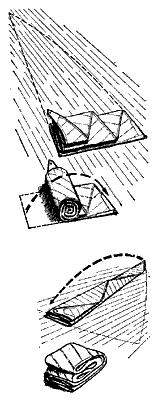 Первый способ: разостланный на ровной, сухой и чистой поверхности парус складывают гармошкой, как показано на рис. 104 (фаловый угол наверху, нижняя шкаторина внизу и передняя— впереди), затем гармошку скатывают от передней шкаторины к шкотовому углу. Уложенный таким образом парус можно сразу же (не разворачивая гармошки) завести нижней шкаториной в паз гика (или ползунами на рельс) и заложить фал в фаловый угол. Другой способ укладки показан также на рис. 104 и пояснений не требует. Он мало отличается от первого. Третий способ самый простой: парус берут за середину мякоти и свободно запихивают в мешок, стараясь только не перекрутить шкаторины; сверху в мешок кладут углы паруса. Способ этот хорош тем, что неплотно скатанный парус меньше слеживается и лучше вентилируется, так как между слоями парусины остается воздух. Паруса из синтетических тканей сырости не боятся, но и их надо просушивать, так как мокрый парус становится жестким и его трудно укладывать. После уборки парусов яхту следует вымыть, откачать из нее воду, прибрать в каюте (кокпите), вытащить для просушки намоченные спасательные принадлежности и другие предметы, а затем поставить ее на стоянку. По бортам яхты надо повесить кранцы, открыть люки для вентиляции внутренних помещений.