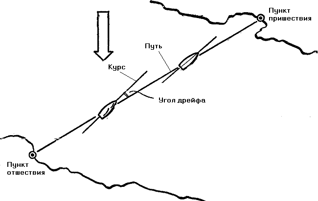 На гоночных швертботах и килевых яхтах основной способ борьбы с креном — откренивание, для чего размещают экипаж на наветренном борту или используют трапецию. Средний вес человека примерно 75 кг, поэтому откренивание весьма действенно. Но в крейсерском плавании при сильном ветре и крене следует обязательно брать рифы или, в крайнем случае, продолжать плавание с немного потравленным гика-шкотом так, чтобы грот работал наполовину. Не надо смущаться тем, что сила тяги может быть потеряна на 15—20%, зато сила дрейфа уменьшится почти вдвое, в результате яхта пойдет с меньшим креном и с большей скоростью. Идя курсом крутой бейдевинд или в гонке на лавировке нужно использовать каждый, даже небольшой, отход ветра, чтобы пройти несколько круче и тем самым выбраться повыше на ветер. При неустойчивом по направлению, со шкваликами, ветре можно выбираться на ветер, используя инерцию яхты. Для это~ го, имея хороший ход, можно приводиться на шкваликах и проходить по инерции вперед и на ветер. Но здесь надо не зевать и вовремя увалиться, чтобы не зависнуть в левентике и не потерять ход. В гонке такое выбегание на ветер, или, иначе говоря, набор высоты, необходимо также для занятия положения на ветре по отношению к сопернику. Во всех случаях, когда рулевой ведет яхту курсом бейдевинд по какому-либо ориентиру, необходимо держать этот ориентир не точно по носу, а немного под ветром, то есть учитывать угол дрейфа (рис. 105). Если этого не делать, судно снесет под ветер настолько, что вместо одного галса придется делать два-три и добираться до цели в лавировку. Величину угла дрейфа можно определить по углу между кильватерной струёй яхты и ее диаметральной плоскостью. В крейсерском плавании вне видимости берегов угол дрейфа учитывается в виде поправки к истинному курсу яхты: ее вычитают при ветре левого галса и прибавляют при ветре правого галса. Введя эту поправку, капитан получает путь яхты — направление ее действительного перемещения относительно воды. Лавировка