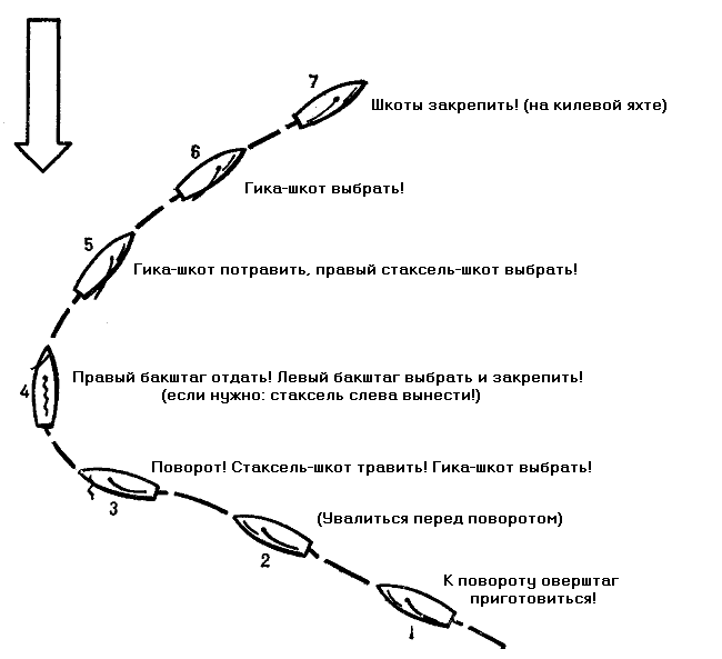 легких швертботов и 40—50° для имеющих большую инерцию килевых яхт и тяжелых крейсерских швертботов. Поворот через фордевинд