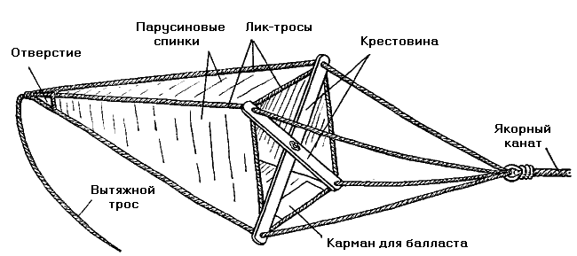 Плавучий якорь (рис. 117) представляет собой конусообразный мешок, сшитый из прочной грубой парусины, имеющий в основании крестообразную распорку или обруч, а в вершине—отверстие для пропуска воды, стабилизирующее рабочее положение якоря. К якорному канату он крепится при помощи четырех концов. Чтобы якорь легче было выбирать из воды, к его вершине крепят тонкий и прочный вытяжной линь. Чтобы не потерять оторвавшийся плавучий якорь, к его основанию прикрепляют небольшой буек на коротком буйрепе. Используют плавучий якорь и как тормоз с кормы при подходе к бочке или причалу с попутным ветром. На реке плавучий якорь отдают с кормы, чтобы яхту не водило течением. Соотношение длины плавучего якоря к диаметру его основания должно быть 5: 2. Временный плавучий якорь можно сделать из шеста (весла, футштока), привязав к нему переднюю шкаторину штормового стакселя (рис. 119). Надо только иметь в виду, что плавучесть шеста должна быть достаточной для поддержания на воде паруса с подвешенной к нему балластиной.