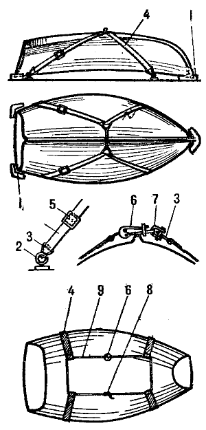 В походном положении тузик крепится на верхней палубе перед мачтой (если есть место) или на крыше рубки. Обычно его кладут вверх днищем и крепят к обухам на палубе двумя крест-на-крест расположенными найтовными концами (рис. 132). На более крупных яхтах, имеющих свободную палубу, тузик можно устанавливать по-корабельному — на специальных кильблоках. В этом случае его крепят не менее чем двумя найтовами (по одному с каждого борта) и закрывают сверху чехлом. Небольшие крейсерские яхты, такие, как широко распространенный «Фольбот», у которых места на палубе для тузика практически нет, могут буксировать его за кормой. Для крепления буксирного конца тузик должен иметь на форштевне, в районе ватерлинии, буксирный рым. А чтобы на ходу его не заливало водой, надевают парусиновый чехол, под которым обязательно должен быть туго натянутый между верхними точками форштевня и транцевой доски леер или деревянная распорка. Тогда вода не скапливается на чехле, а скатывается за борт. Чехол прочно крепят шнуровкой к небольшим обушкам или кольцам, ввернутым в борт тузика под буртиком. Чтобы буксировать тузик более или менее спокойно, буксирный конец должен быть строго определенной длины. Один из опытных яхтсменов предвоенных лет, ленинградец Н. Ю. Людевиг, советует: «Если шлюпку буксируют за кормой, то фалинь вытравливают такой длины, чтобы она шла на гребне следующей за яхтой волны. При курсах попутных— фордевинд или бакштаг—длина фалиня должна быть увеличена по крайней мере в два раза, иначе в моменты, когда тузик будет спускаться с волны, он, подгоняемый гребнем и ветром, получает такой большой ход, что может ударить своим штевнем в корму яхты. Если длину буксира дать такую, чтобы тузик оказался в долине волны, а яхта на гребне, то толчки, образующиеся от разности в скоростях, будут настолько велики, что конец почти всегда лопнет»**. Конечно, такая буксировка не очень удобна для экипажа, особенно в свежую погоду. Пляшущий на буксире тузик, несмотря на свою легкость, снижает скорость и управляемость яхты. Но, несмотря на это, польза тузика в плавании настолько очевидна, что любые связанные с ним хлопоты, в том числе и буксировка, окупаются полностью. Если яхта идет вдоль волны, тузик удобно буксировать под подветренным бортом. «Для этого закладывают носовой фалинь на одну из уток около бакштага, а кормовой — на носу яхты. Регулируя натяжение этих снастей, добиваются того, что тузик отрыскивает несколько в сторону и спокойно идет под ветром в воде, поверхность которой несколько сглажена прошедшей яхтой»***. Необходимо иметь в виду, что при небольших размерах тузик — это валкое и верткое суденышко. Поэтому в нем не следует становиться на ноги и все работы, в особенности такие, как завоз якоря и промеры, нужно выполнять только сидя. Греблю на тузиках можно доверять только достаточно хорошо подготовленным матросам. Чтобы завезти на тузике якорь, поступают следующим образом. Подводят тузик кормой к яхте и удерживают в этом положении. Вооруженный якорь укладывают на корме тузика так, чтобы его лапы находились на транце, а шток упирался в рыбину. Если якорь без штока, то его веретено кладут на кормовое сиденье тузика. После погрузки якоря в корме тузика бухтой укладывают канат или часть его свободными шлагами, следя, чтобы они не перепутались. После этого туз