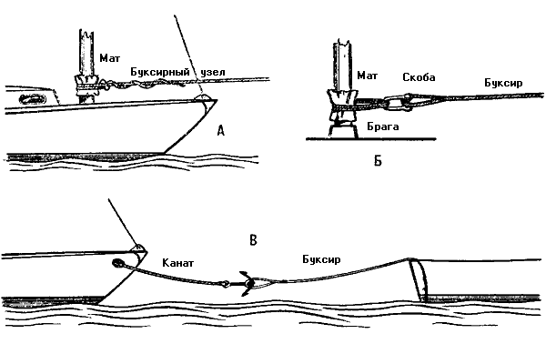 Буксироваться на яхте, не имеющей своего двигателя, приходится в следующих случаях: — при проходе таких мест, где по каким-либо причинам нельзя идти своим ходом под парусами; — после аварии (потеря мачты, поломка руля и т. п.); — при перемене места в гавани; — на реке против течения в слабый ветер или штиль. Кроме того, каждый яхтенный рулевой (капитан) может оказаться перед необходимостью взять на буксир другое судно: швертбот, яхту или катер. В яхтенной практике применяются в основном два вида буксировки: — за кормой, когда буксирный трос (буксир) подают с кормы буксирующего судна на, буксируемое, — лагом, когда буксируемое судно швартуется своим бортом к борту буксирующего. Буксировать яхты лагом можно только по спокойной воде, а во всех других случаях за кормой. При буксировке за кормой используют растительные или синтетические тросы. На буксируемой яхте их крепят буксирным узлом за мачту или битенг (если его прочность не вызывает сомнений; рис. 137, а). Под буксирный узел на мачту обязательно кладут мат или сложенный в несколько раз кусок парусины, чтобы предохранить ее от трения. Буксир прихватывают на баке прочным концом, серьгой, за любой надежно закрепленный в диаметральной плоскости предмет (утку, обух, носовой роульс)— тогда яхта не будет рыскать. Иногда, особенно когда нет растительного троса нужной длины, для буксировки можно использовать и стальной трос. Но крепить его следует за брагу вокруг мачты *, сделанную из растительного или синтетического троса (рис. 137, б).