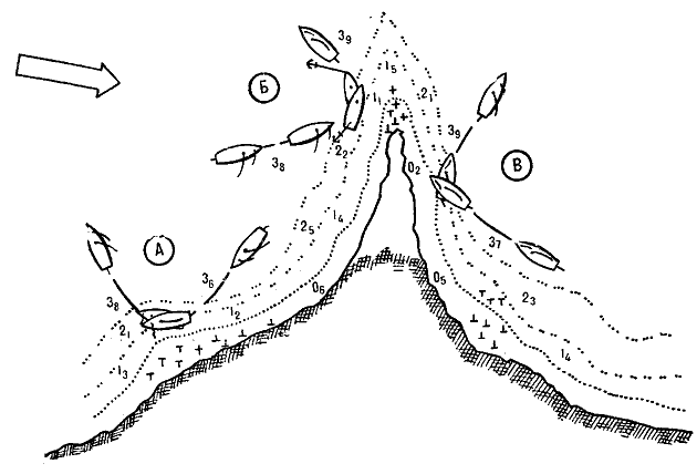 В практике плавания на яхтах принято рассматривать три основных случая посадки (рис. 138): — на мель, находящуюся под ветром от курса яхты (на подветренную); — на мель, находящуюся на ветре (наветренную); — на банку — отдельно лежащую небольшую мель, глубины на которой резко отличаются от окружающих глубин. Нужно сказать, что при внимательном наблюдении иногда можно своевременно заметить приближение к мелкому месту — оно отличается более светлой окраской водной поверхности и более крутой волной по сравнению с цветом воды и волной на глубоком месте. Наиболее опасна посадка на подветренную мель; в этом случае волна и ветер, действуя в одном направлении, выбрасывают яхту дальше на мель. Первым и немедленным действием рулевого яхты, коснувшейся подветренной мели на остром курсе, должна быть попытка сделать поворот оверштаг. Чтобы облегчить его, раздергивают стаксель-шкоты, гика-шкоты выбирают втугую, а с носа упираются в грунт футштоком или другим шестом, стремясь развернуть нос яхты в сторону поворота (глубокой воды). Одновременно всеми доступными средствами создают крен, чтобы уменьшить осадку. Как только яхта встанет в положение левентик, стаксель выносят на ветер, гика-шкот немного потравливают, чтобы снять давление ветра на корму, и на новом галсе сходят с мели. При плотной посадке, когда яхта не пошла дальше левентика, необходимо завести в сторону глубокой воды якорь и сниматься с его помощью. Паруса при этом не убирают, гика-шкот держат втугую, стаксель выносят на ветер, чтобы сохранить нужный крен, и продолжают работать футштоками до схода яхты на глубокую воду.