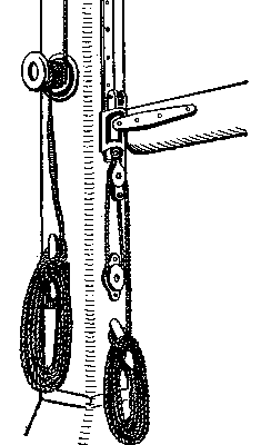 У двухмачтовой яхты к названиям частей стоячего такелажа прибавляется название мачты (например, бизань-ванты, основные грота-ванты, грота-штаг, фор-топ-штаг, бизань-бакштаг и т. д.). Двухмачтовые яхты часто имеют еще штаг-карнаки, соединяющие топы мачт. У иола и кэча штаги бизань-мачты мешали бы свободному переходу грота с борта на борт, поэтому передние основные бизань-ванты выносят настолько вперед, что они заменяют штаги. Ванты и штаги крепятся к корпусу на соответствующих оковках — вант-путенсах и штаг-путенсах, надежно закрепленных на самом корпусе яхты. Натяжение вант осуществляется талрепами — винтовыми стяжками (рис. 40). Гик —горизонтальное рангоутное дерево, к которому одним из способов (рис. 37) крепится нижняя шкаторина грота (бизани, фока). Гик грота называется грота-гик ***, гик бизани — бизань-гик, гик фока — фока-гик. Конец гика, упирающийся в мачту, называется пяткой, противоположный конец — ноком. Пятка гика имеет оковку, которая входит в вертлюг, позволяющий гику поворачиваться в стороны и вверх. Вертлюг часто делают передвижным вверх по рельсу (особенно на гоночных яхтах), чтобы иметь возможность добрать парус, не трогая фала, при помощи галс-оттяжки (рис. 41). Если рифы берут накручивая парус на гик, то для вращения гика применяют машинку — патент-риф, смонтированную с оковкой пятки.