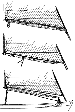 На ноке гика укрепляются оковки для присоединения гика-топенантов — снастей бегучего такелажа, поддерживающих нок. Шкотовый угол крепят к ползунку, передвигающемуся по рельсу. Ползун имеет шкив для грота-шкота, которым растягивается нижняя шкаторина гика. Грота-шкот крепится на утку или стопор на гике или вяжется вокруг гика. На крупных яхтах риф-шкентели проводят через бисы —деревянные планки или оковки со шкивами (рис. 42). На малых яхтах устройство много проще.
