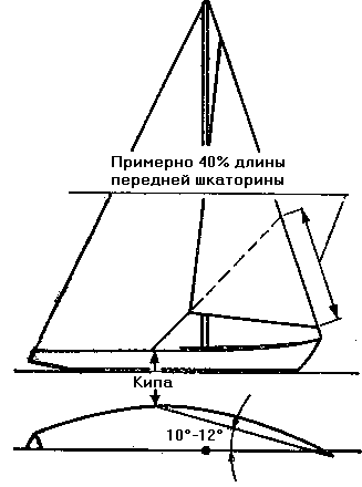При прочих равных условиях к. п. д. блока тем больше, чем больше отношение диаметра шкива к диаметру нагеля и диаметру троса. Поэтому надо, чтобы относительные диаметры блоков были достаточно велики. Практика показала, что диаметр шкива (по канавке для троса) не должен быть меньше четырех-пяти диаметров троса, а толщина шкива—не менее 1, 4—1, 5 диаметра троса. В противном случае тали будут давать столь малый выигрыш в силе, что такелаж окажется не бегучим, а скорее ползучим. Блоки бывают одношкивные, двух-шкивные, реже — многошкивные. На современных яхтах вместо талей часто применяют небольшие лебедки, фаловые и шкотовые, сильно упрощающие конструкцию и облегчающие работу с бегучим такелажем. Для управления парусами служат шкоты. В зависимости от паруса шкоты называют клввер-шкот, стаксель-шкот и т. д. Шкоты парусов, привязанных к гикам, носят название гика-шкотов (на одномачтовых яхтах), бизань-гика-шкотов, грота-гика-шкотов и фока-гика-шкотов (на двухмачтовых яхтах). Если грот не имеет гика, парус управляется грота-шкотом (бизань-шкотом, фока-шкотом, трисель-шкотом). Так как управление гика-шкотами требует значительных усилий, тоихпроводят в виде талей. Проводка гика-шкотов может быть выполнена самыми разнообразными способами, но все их можно разделить на две группы: в один конец и в два конца. При проводке в один конец коренной конец гика-шкота крепится на гике, а ходовой проходит поочередно через ряд блоков на палубе и гике, образуя тали гика-шкота. При проводке в два конца оба конца ходовые, и с ними можно работать или вместе, или поочередно, закладывая один из концов на палубе. Шкоты передних парусов должны быть проведены таким образом, чтобы тяга шкота проходила примерно по линии, соединяющей шкотовый угол паруса с точкой, лежащей на расстоянии, составляющем 40% длины передней шкато-рины от галсового угла (рис. 46). На палубе шкоты проходят через кипы — втулки с отверстиями для шкота или через блочки, которые можно передвигать по рельсам для точной настройки. По ширине кипы должны быть поставлены таким образом, чтобы линия, соединяющая точку крепления галсового угла на палубе с центром кипы, составляла с диаметральной плоскостью яхты угол не менее 10—12 (как показано на рис. 46). Это не всегда удается на сравнительно узких гоночных яхтах.