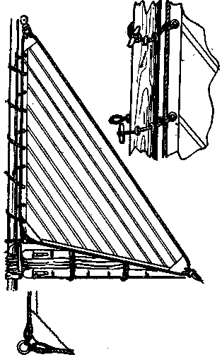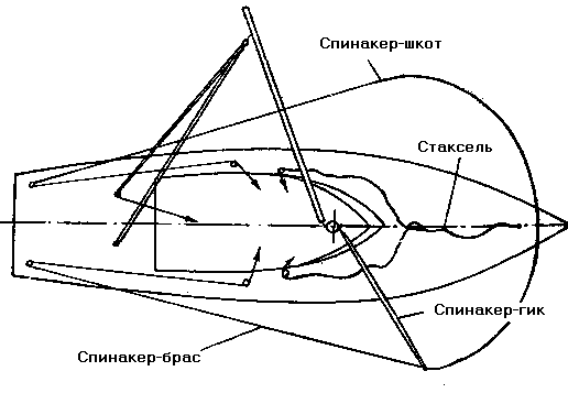 Спинакером называется большой пузатый парус, который ставят в дополнение к гроту на полных курсах, до галфвинда включительно, на стороне, противоположной гроту (рис. 47). Поднимают его спинакер-фалом и несут на спинакер-гике, упертом пяткой в мачту. Галсовый угол спинакера крепится к ноку спинакер-гика*; шкотовый угол управляется спинакер-шкотом, проведенным снаружи вант и штага на корму. Спинакер-гик управляется брасом (рис. 48), идущим на корму, и коятр-брасом, идущим на бак**. Для того чтобы нок спинакер-гика не опускался и не поднимался, применяют спинакер-гика-топенант и оттяжку спинакер-гика. Оба конца спинакер-гика имеют оковки для быстрого соединения с проушиной на ползуне, который скользит по рельсу, поставленному на передней кромке мачты, или с неподвижной оковкой. Обычно оковка на ноке спинакер-гика имеет вид крюка с защелкой, которая может быть вдвинута тросиком, серединой заделанным за спинакер-гик, а концами — за защелки. При слабых и средних ветрах на курсах полный бейдевинд и при лавировке применяют так называемые генуэзские стаксели — передние паруса большой площади, которые ставят вместо стакселя (на крейсерских яхтах — вместо всех передних парусов на топ-штаге). Штормовые паруса ставят в штормовую погоду. Они отличаются от лавировочных меньшими размерами и повышенной прочностью — их шьют из более прочной парусины. Наиболее часто применяются трисели и штормовые передние паруса: штормовой стаксель, штормовой кливер и т. д. К штормовым парусам относятся также штормовые гроты, имеющие меньшую площадь, чем обычный полномерный грот. Трисель (рис. 49) ставят вместо грота и поднимают грота-фалом (при бермудском вооружении) или гарделью (при гафельном). Управляется он трисель-шкотом, заложенным на шкотовый угол и проведенным на корму яхты таким образом, чтобы линия тяги шкота делила шкотовый угол триселя примерно пополам. Трисель не имеет гика; обликован он по всем шкаторинам. На маленькой яхте вместо триселя можно использовать крепкий стаксель, поставив его передней шкаториной на мачту. * На крупных яхтах имеется еще спинакер-галс—снасть, идущая от галсового угла спинакера через блок на ноке спинакер-гика на корму яхгы. ** На малых яхтах обходятся без контрбраса.
