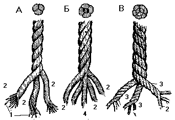 Растительные тросы выделывают следующим образом. Из волокон, если представить их подвешенными отвесно, вращением по часовой стрелке, «по солнцу», свиваются каболки. Из некоторого числа каболок, но уже против часовой стрелки, «против солнца», свивают пряди. Из трех или четырех прядей, снова «по солнцу», свивают трех- или четырех" прядный трос тросовой работы прямого спуска. Если каболки свивать «против солнца», пряди — «по солнцу», а трос — «против солнца», получится трос тросовой работы, но обратного спуска. Четырехпрядный трос внутри между прядями имеет еще пятую, слабо свитую и вытянутую прямо прядь, которая называется сердечником. Четырехпрядный трос эластичнее, но слабее трехпрядного на 10—20%. Если прядями для троса служат трехпрядные тросы тросовой работы, то каждый из них называется стрендью, а свитый из них трос — тросом кабельной работы. Обычно тросы тросовой работы прямого спуска, а кабельной работы — обратного. Структура этих тросов показана на рис. 55. Чтобы узнать, какого спуска данный трос, можно воспользоваться следующим правилом: если на направление прядей можно наложить русскую букву «И», это трос прямого спуска, витки пряди идут как витки винта правого шага; если же на направление прядей можно наложить латинскую букву «N», то это трос обратного спуска (как винт левого шага). Тросы кабельной работы на 15—20% слабее, чем тросовой работы. На яхтах широко применяются также плетеные (фаловые) тросы. Они изготовляются в виде плетеной трубки с сердечником или без него. Это лучшие тросы для снастей бегучего такелажа, не испытывающего очень больших напряжений: шкотов, такелажа спинакера и т. п. Плетеные тросы делаются из льняных, хлопчатобумажных или синтетических нитей. По техническим показателям растительные тросы делятся на специальные, повышенные и нормальные; по степени скрутки — на туго и слабо свитые. Выделка синтетических тросов не отличается от выделки растительных. Так, капроновый трос, изготовляемый из капронового волокна, делается следующим образом. Нити из капронового волокна скручиваются «против солнца» в так называемую филаментарную нитку; несколько таких ниток скручивают «по солнцу» в каболки; каболки скручивают «против солнца» в пряди, а из трех прядей «по солнцу» свивают уже трос тросовой работы. Далее капроновый трос можно подвергнуть термостабилизации для фиксации его свитой структуры и пропитать особым составом, чтобы предохранить от загорания. В отличие от растительных и синтетических стальные тросы свивают из шести, семи и более прядей. Вокруг пенькового сердечника свивают пряди из оцинкованной или нержавеющей проволоки, а из прядей вокруг пенькового же или проволочного сердечника свивают трос. Пеньковые сердечники придают тросам гибкость и сохраняют смазку, предохраняющую сердечник от гниения, а внутренние проволоки от ржавления. Жесткие тросы делают только с центральным проволочным или пеньковым сердечником. По способу изготовления стальные тросы могут быть: — спиральной свивки или однопрядные, когда трос представляет собой одн\ прядь, так называемые бензельные тросы; — крестовой свивки или двойной крестовой свивки; этот спуск подобен спуску обычного пенькового троса тросовой работы; проволоки в этих тросах, по рисунку поверхности троса, расположены параллельно его оси; — кабель