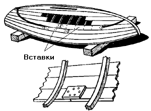 Если на старом такелаже клетневка потерлась, ее следует заменить. Все талрепы нужно расходить и смазать, чтобы они легко вращались. Мелкие дыры на парусах штопают, а на крупные накладывают заплаты. Распоровшиеся швы прошивают на машине или вручную. Кренгельсы углов и фаловая дощечка иногда ползут, разрывая боут. В этом случае боуты выпарывают, нашивают новые, затем ставят новый кренгельс и пришивают или приклепывают фаловую дощечку. Из дельных вещей наиболее часто требуют ремонта лебедки шкотов. У роликовых лебедок обычно снашиваются ролики, их заменяют новыми, диаметром на 0, 1—0, 2 мм больше. У плунжерных лебедок быстро снашиваются и требуют замены пальцы. Работы с корпусом начинают со шлюпочного ремонта — с замены гнилых досок обшивки новыми, с ремонта или замены равендука и других столярных работ. Вмятины на бортах и форштевне можно заделать эпоксидным клеем с наполнителем из древесной муки. Для этого поврежденное место тщательно зачищают стеклянной шкуркой, удаляя находящуюся внутри вмятины краску или лак, а также возможные задиры и защепы. Зачищенное место обезжиривают ацетоном, после чего шпаклюют смесью клея и муки. Так как она стекает по вертикальной поверхности (борт, штевень), то поверх шпаклевки накладывают лист бумаги, который не позволяет ей вытекать из вмятины. Через сутки, если шпаклевка высохла, ее можно заровнять вначале грубым напильником, а затем шкуркой. Заделанная таким образом вмятина не очень выделяется ни на красном дереве, ни на сосновом лакированном борту и будет совсем незаметна, если борт крашеный. Если в обшивке борта обнаружено гнилое место или есть пробоина, то удаляют с некоторым запасом кусок одного или двух-трех поясов. Прежде чем это делать, намеченное место необходимо зачистить, чтобы обнаружить пазы и определить точные границы вырубки пояса. Если обшивка стоит на шурупах, то, удалив пробки, нужно вывернуть шурупы, а если обшивка на заклепках, их нужно обкусать на шпангоутах. Вырубают пояс стамеской, стараясь не повредить здоровые соседние пояса и помня о том, что они между собой могут быть пронагелеваны через кромки металлическими гвоздями. При вырубке нескольких поясов нужно учитывать, что стыки вставок со здоровой обшивкой должны быть разогнаны по длине. Вставки делают из однородного сухого дерева, тщательно подгоняют и ставят на клей (ВИАМ-Б-3 или эпоксидный), после чего крепят к шпангоутам шурупами или медными заклепками (рис. 73). Целый пояс заменяют точно так же, но, кроме того, подгоняют его концы в шпунты штевней. Надо учитывать, что чем длиннее пояс, тем труднее подгонять его.