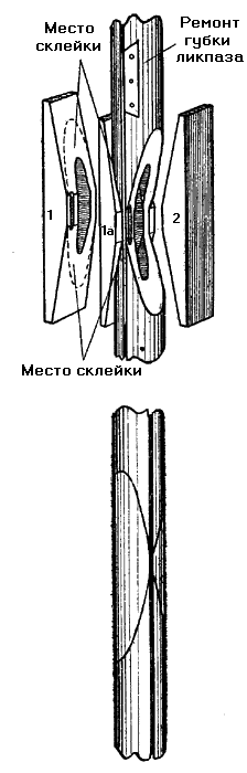 Вставки в палубе делают подобным же образом. При смене равендука на палубе приходится снимать буртики вдоль комингса рубки и по борту. Но если равендук был поставлен под ватервейсы, то, чтобы не снимать их, можно выбрать по внутренней кромке ватервейса небольшой паз—канавку. Затем, заготовив рейку по форме сечения канавки и по длине ватервейсов, кладут новый равендук на масляную шпаклевку или на клей, а его края прячут в канавку ватервейса и прижимают заготовленной рейкой. Ремонт деревянной мачты, у которой поползли оковки, следует начинать со снятия оковок. Места, где были оковки, нужно застрогать фуганком (сделать лыски). На эти места наклеивают нужной толщины доски, которые затем строгают по форме мачты. Если обнаружится, что сквозной болт, крепящий оковку, пополз, промяв дерево, в отверстие следует поставить на клею деревянный нагель. После этого мачту шкурят, лакируют и ставят оковки точно на старые места, проверив, если надо, по чертежу. Небольшой кусок надколотого лик-паза можно приклеить, закрепив тонкими длинными гвоздями. Если же повреждена значительная часть лик-паза, то весь этот кусок вырубают, а на его место наклеивают новый, изготовленный заранее. Сломанную мачту можно ремонтировать следующим образом (рис. 74). Оба сломанных конца застрагивают с боков на клин. Из сухих досок заготавливают две новые половинки; если требуется, в них нужно сделать полость и лик-паз. Эти половинки наклеивают с боков на застроганные концы. Как только клей высохнет, их обрабатывают рубанком и фуганком по форме мачты. Здесь очень важно сохранить первоначальную длину мачты, чтобы не переделывать такелаж, заново подгоняя его. На металлическом корпусе части обшивки с дефектом вырезают автогеном, а на их место ставят новые листы. Заменять большие листы сложнее: их нужно выгнуть по форме обводов корпуса, а это не всегда можно сделать в условиях яхт-клуба. Пластмассовые корпуса ремонтируют с помощью полиэфирных или эпоксидных смол и стеклоткани. На яхтах, проплававших одну-две навигации, иногда обнаруживается весьма серьезный дефект — отдельные пояса обшивки деформируются, коробятся, в результате поверхность корпуса становится неровной, пояса выпирают относительно друг друга, что существенно отражается на ходовых качествах. Такой корпус нужно строгать, и лучше, если это сделают квалифицированные мастера. Приступая к малярным работам, нужно прежде решить, чем лучше красить яхту: масляными красками, пентафталевыми эмалями, лаками или специальными смоляными лаками на основе клея ВИАМ-Б-3 либо эпоксидной смолы. выбор того или иного покрытия определяет и подготовку корпуса — его зачистку и шпаклевку. Надо иметь в виду, что такие покрытия, как лаки на основе клея ВИАМ-Б-3 или эпоксидной смолы, настолько хорошо сохраняются, что не требуют обновления, нужно лишь подшпаклевать царапины и выбоины, подмазать эти места и слегка отполировать. Некоторые гоночные швертботы, участвующие в заключительных гонках сезона — первенство СССР, обычно перед состязаниями красят. Но если зимой судно хранилось в эллинге или под навесом, то весной его корпус нужно лишь вымыть теплой водой.