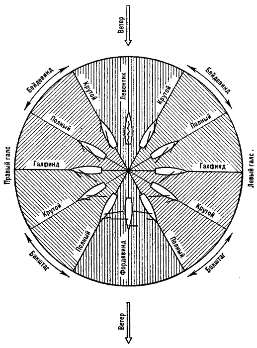 Ясное понимание и правильное использование принятых в парусном спорте терминов очень важно для четкой работы экипажа яхты, при исполнении команд и в других случаях, при решении специальных вопросов. — Курс яхты — в навигации угол между северной частью меридиана и диаметральной плоскостью яхты. Измеряется он в градусах—от 0 до 360° и задается рулевому по компасу (компасный курс). В парусном деле существует курс судна относительно ветра —угол между направлением ветра и направлением движения судна, отсчитываемый от носа. В зависимости от величины этого угла курс относительно ветра может быть острым или полным (рис. 101). Курсом называется также направление, по которому движется яхта. — Бейдевинд —острый курс относительно ветра, когда ветер дует под углом от 0 до 80°. Может быть крутой бейдевинд (до 50°) и полный (от 50 до 80°). Полными курсы считаются, когда ветер дует под углом близким к 90° или под тупым углом к направлению движения яхты. К таким курсам относятся: — Галфвинд (или полветра) — ветер дует под углом от 80 до 100°. — Бакштаг — ветер дует под углом от 100 до 150° (крутой бакштаг) и от 150 до 170° (полный бакштаг). — Фордевинд — ветер дует в корму под углом от 170° одного борта до 170° другого борта. — Угол ветра — угол между направлением ветра и диаметральной плоскостью парусного судна, отсчитываемый от носа яхт; курс относительно ветра, выраженный в градусах. — Левентик — положение яхты относительно ветра, когда угол ветра около нуля. Паруса в левентике полощут и не работают, а яхта, долго находящаяся в таком положении, постепенно забирает задний ход.